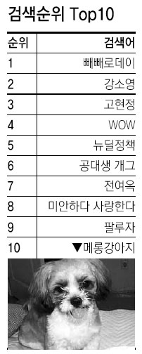 미국이 이라크 저항세력의 거점인 팔루자에 대대적인 공격을 시작했다는 외신이 들어오면서 ‘팔루자’가 9위에 올랐다. 10위 ‘메롱강아지’는 귀여운 외모와 혀를 내밀고 있는 모습으로 유명한 강아지. 인터넷에 사진이 떠돌면서 유명세를 타고 있다.