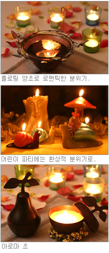 동화 속에 나올 법한 신비로운 분위기의 장식. 어린이 방이나 어린이들만의 파티에 분위기를 연출하는 데 그만이다. 의인화된 나무 모양의 양초와 달팽이, 요정이 버섯 아래 서 있는 모양의 초가 이색적이다. 색상은 오렌지, 보라, 연두 등으로 화려한 것을 선택한다. 숲 속 분위기가 나는 나뭇가지 등으로 장식하면 좋다.