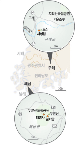 전남 구례군 문척면 죽마리 오산(513m) 정상에 위치한 사성암. 그곳에 올라서면 산자락을 휘감으며 구불구불 흐르는 섬진강 줄기와 구례읍의 넓은 벌판, 멀리 무등산으로 이어지는 능선과 지리산 연봉이 그림처럼 펼쳐진다.