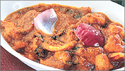 ▽만드는 법=팬에 기름을 살짝 두르고 붉은 양파와 파를 넣어 밤색이 날 때까지 볶는다. 다른 팬에 닭고기 육수, 삶은 양파와 강황, 가람 마살라, 소금, 계핏가루를 넣고 걸쭉해질 때까지 볶은 뒤 믹서에 갈아 30여 분 정도 더 끓인다. 여기에 볶아둔 붉은 양파와 파, 닭고기를 넣고 센 불에 계속 저어주면서 소금과 고춧가루로 간을 맞춘다. 다진 고수잎을 넣고 레몬주스를 두세 방울 떨어뜨린다. 다시 걸쭉해 질 때까지 볶으면 완성.