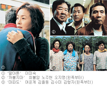 다음달 11일 개봉예정인 코미디 영화 ‘마파도’는 중견 여배우들로 승부를 건다. 여운계(65) 김을동(60) 김수미(54) 김형자(55)가 ‘마파도’라는 수상한 섬에 사는 ‘엽기 할머니’들을 연기하는 것. 이들은 마파도를 찾은 두 명의 건달(이정진 이문식)을 혼내준다. 이들이 일자 단발머리 가발에 주홍색 트레이닝복 차림으로 낫을 든 채 무표정하게 정면을 응시하는 ‘눈뜨고 못 볼’ 이 영화 포스터는 벌써부터 화제가 되고 있다.