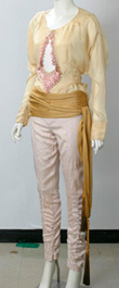 가슴 부위에 술 장식이 달린 베이지색 실크 블라우스와 연분홍색 실크 스키니 팬츠(‘구찌’)를 입고 허리둘레에 두껍고 긴 복대식 갈색 천 벨트를 묶어 발목 부위까지 늘어뜨린다.