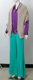 광택이 도는 보라색 실크 블라우스(‘돌체 앤 가바나’)에 민트색 와이드 팬츠(‘오브제 by Y&K’)를 매치하고 성기게 손으로 뜬 연회색 니트 볼레로 스타일 카디건과 커다란 은색 체인벨트를 헐렁하게 걸친다.