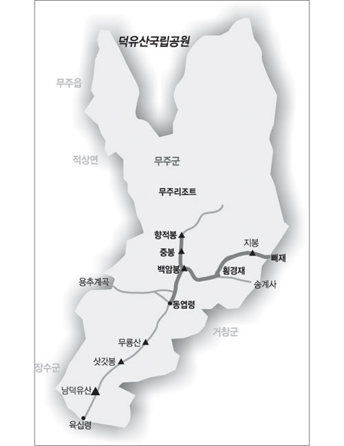 지리산 천왕봉에서 시작한 백두대간 산줄기가 동쪽으로 방향을 튼 뒤 북상하며 뻗어있는 줄기가 덕유산이다.