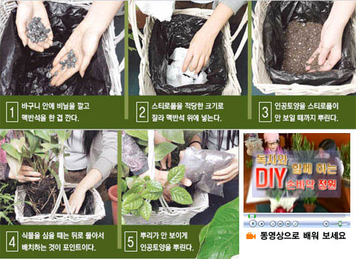 바구니 정원을 깔끔하게 마무리하기 위해 이끼(1봉지 3000원)로 흙 위를 덮어 준다. 앞부분의 빈 공간에 흰 자갈을 원근을 살려 깔아 주면 시냇물이나 오솔길 같은 효과를 줄 수 있다. 자갈은 시냇물을 보는 것처럼 뒤쪽은 좁게, 앞쪽은 넓게 배치하는 것이 요령.