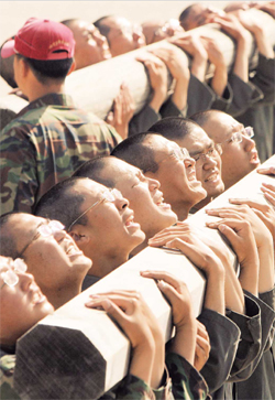 특이한 점은 소대원 상당수가 입대 전 운동선수였거나 체육대학 출신자라는 점. 훈련병 소대장인 허수행(22·입대 전 92kg →현재 82kg) 씨는 복싱 선수 출신으로 중학생 때 충남지역 라이트 웰트급 3위 입상자다.