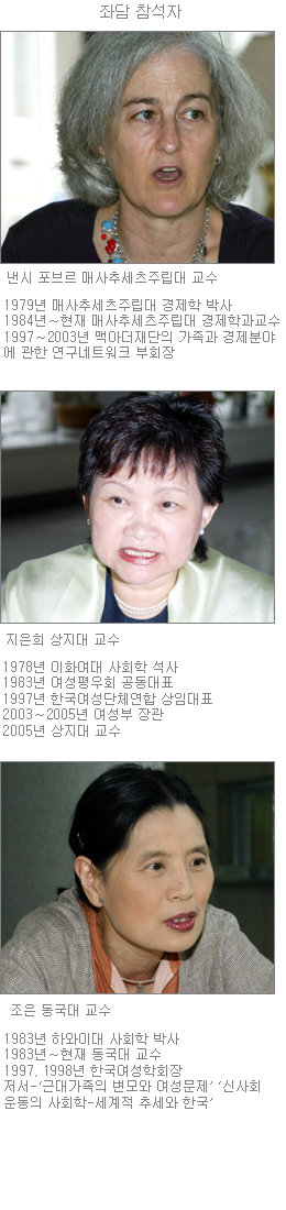 돌봄노동이 무엇이기에. 어린아이를 보호하고 늙은 부모를 살피고 병에 걸린 식구를 간호하고…. 뭐가 문제인가. 이 대회에 참석한 낸시 포브르(52) 미국 매사추세츠주립대 경제학과 교수와 지은희(58·전 여성부 장관) 상지대 여성학 교수, 조은(59) 동국대 사회학과 교수가 ‘여성과 돌봄 노동’을 주제로 얘기를 나눴다. 좌담은 포브르 교수가 대회 기간 중 머무른 이화여대 한우리기숙사 로비에서 이뤄졌다.》