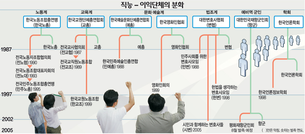 직능 및 이익단체들의 이념 분화가 가시화된 것은 1980년대 말∼1990년대 초. 1987년 6월 민주화 항쟁을 계기로 억눌렸던 소수 진보 세력의 목소리가 수면 위로 올라온 것이다.