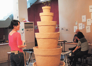 갤러리를 나서니 밤 12시가 가까워졌다. 서교동 쪽으로 10여 분 걸어가니 ‘다빈치 갤러리’라는 작고 빨간 정사각형 간판이 보인다. 이 시간까지 문을 연 갤러리가 있다니…. 지하로 내려가 보니 입체미술가 송원진 씨의 2m 높이 화분 작품이 심야의 관람객을 맞는다. 30평가량의 전시 공간에는 인간 간의 따뜻한 소통을 형상화한 송 씨의 작품들이 곳곳에 배치돼 있다.