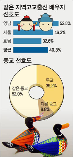 자신과 같은 지역의 고교 출신을 배우자로 선택한 비율은 40.3%에 달했다. 특히 영남 서울에서 이런 현상이 강했다.