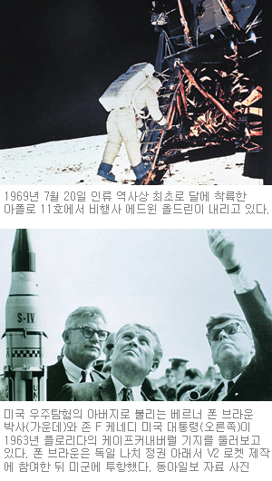 ▽달에 가는 것보다 돌아오는 게 문제였다=인간을 달에 보내는 데는 처음부터 이론적으로 큰 문제가 없었다. 문제는 달에서 어떻게 지구를 향해 출발하느냐였다. 처음에는 “일단 인간을 보내 놓고 몇 년 동안 살게 하면서 방법을 강구하자”는 안까지 제기됐다. 결국 모선(母船)이 달 주위를 도는 동안 착륙선이 내려가는 방법이 채택됐다.