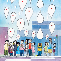 횡단보도 앞, 사람들이 서 있다. 어린이와 커플을 제외하고는 모두 휴대전화를 가지고 있다. 단 한 사람, 고개를 푹 숙인 남자의 손에서 미끄러진 휴대전화는 방금 인도에 떨어진 듯하다. 사람들 위로 말풍선이 구름처럼 떠오른다. 그 속에는 빨간 하트가 하나씩 들어 있다. 그러나 고개를 숙인 남자의 머리 위로는 말풍선이 빗방울처럼 떨어진다. 그곳에 빨간 하트는 보이지 않는다.