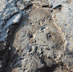 ∇연대 측정의 딜레마=2003년 10월 제주 남제주군에서 발견된 사람 발자국 화석은 방사성탄소연대측정법으로 화석 주변의 유기물을 측정한 결과는 약 1만5000년 전(1만3513∼1만5161년 전), 발광법(發光法)으로 측정한 결과는 약 7500년 전(6800∼7600년 전·오차 생략)으로 나타났다. 손영관(지구과학) 경상대 교수는 “유기물의 연대가 1만5000년 전이라는 것이지 발자국이 찍힌 시기가 1만5000년 전이라는 것은 아니다”고 말했다.