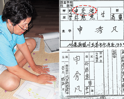 ![]() 단재 신채호 선생의 며느리 이덕남 씨가 12일 서울 강남구 포이동 자택 거실에서 시아버지와 남편 신수범 씨에게 제대로 된 호적을 찾아 주기 위해 모아 온 각종 서류를 보여 주고 있다(왼쪽). 신수범 씨의 1933년 호적에는 아버지난이 비어 있다(오른쪽 위). 오른쪽 아래는 1986년 소송 끝에 신채호 선생의 이름이 기재된 호적. 동정민 기자 |