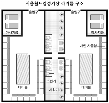 긴장을 풀려고 주문을 외는 스타 플레이어의 이면을 들여다볼 수 있는 곳이다. 경기 결과에 따라서는 질책이나 다짐이 쏟아지는 곳이기도 하다. 그래서 라커룸은 늘 닫혀 있다.