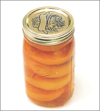 4.소독한 병에 뜨거운 복숭아 당조림을 담고 뚜껑을 덮은 뒤 뒤집어서 식힌다. 이렇게 하면 병 속의 공기가 빠져나가 보존성이 좋아진다.