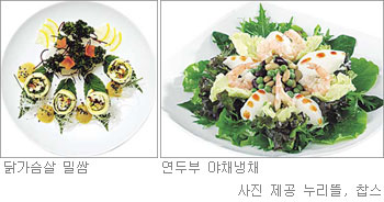 국제 행사에서 음식 외교 활동을 펴고 있는 숙명여대 식품영양학과 한영실(48) 교수는 “바탕은 한식이되 외국인에게 익숙한 재료로 살짝 변형을 준다”고 말한다. 수삼 냉채에 셀러리 같은 서양식 채소를 넣는 방식 등이다. 상차림은 서양식이지만 냅킨을 조각보처럼 만들거나 한국적 분위기의 소품을 활용한다.