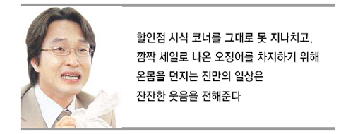 ‘남성 전업 주부’라는 소재 자체가 새롭고 흥미로운 만큼 영화는 이 점을 마음껏 활용한다. 전통적인 남편과 아내의 역할과 대사를 바꾸어 주된 웃음 코드로 활용하는 것. 할인점 시식 코너를 그대로 못 지나치고, 깜짝 세일로 나온 오징어를 차지하기 위해 온몸을 던지며, 몸매 관리를 위해 동네 아줌마들과 경보를 하는 진만의 일상은 잔잔한 웃음을 전해준다. 여기에 남성인 그를 왕따시키지 않고 한 팀에 끼워주는 이웃 주부들과 완고한 아버지가 “할 거면 제대로 해라”고 아들을 은근히 격려하는 모습도 신선하다.