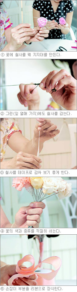 권 씨는 부케 중앙의 잘 보이는 부분에 노란 장미를 넣었다. 노란 장미를 중심으로 다른 꽃들을 둥글게 둘러가면서 모양을 잡는다. 옆으로 갈수록 높이를 낮게 한다. 도중에 꽃 지지대를 철사로 고정해 주면 작업이 편하다. 그린은 꽃 사이에 넣는다. 잎사귀 같은 그린은 모양을 잡은 뒤 한쪽 모서리에 넣어 주면 된다.