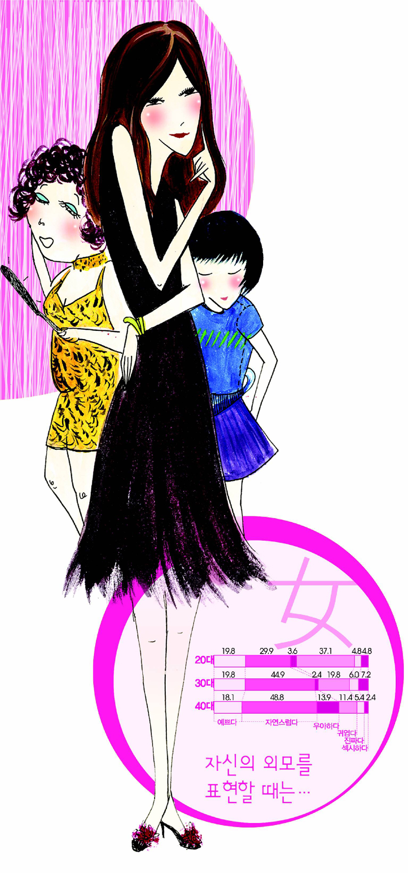 그렇다면 한국의 남녀들은 여자의 외모를 표현할 때 어떤 말을 가장 많이 쓸까. 동아일보 위크엔드는 여론조사회사인 나우앤퓨쳐(www.nownfuture.co.kr·전 아이클릭)와 함께 20∼40대 남녀 각각 500명에게 인터넷 설문을 던졌다. 남자에게는 여자의 외모를, 여자에게는 자신의 외모를 표현할 때 어떤 말을 가장 많이 쓰는가를 물었다.