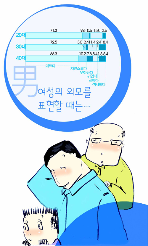 여성의 외모에 대해 남성들은 ‘예쁘다’(70%)를 가장 많이 사용하는 것으로 나타났다. 김 홍보파트장은 “외모 표현에 구체적이고 적극적인 여성에 비해 남성들은 전체 분위기를 표현하는 경향이 높다”고 말했다.