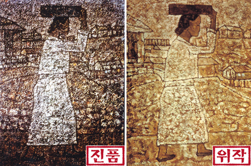 ▽위작의 타깃이 되는 주요 작가들=위작 문제가 본격 대두된 것은 미술시장이 활성화된 1980년대 초부터다. 1980년대 후반에는 이중섭 박수근 장욱진 김환기 도상봉 오지호 화백 등 유명 작가 도록에 실린 작품을 사진기로 찍은 뒤 필름을 환등기로 비추어 정밀하게 복사한 위작이 나오기 시작했다. 1990년대에 와서는 더욱 지능화돼 이미 발표됐거나 잘 알려진 작품 대신 작가가 심심풀이로, 혹은 실험적으로 습작한 듯한 스타일의 위작들이 등장했다. 작고한 유명 작가의 비싼 작품에 한정됐던 위작이 황유엽 김영주 장이석 조병덕 화백 등 생존 작가 중심으로 바뀐 것도 특징이다.