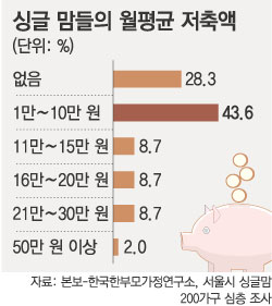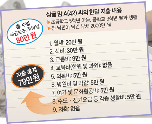 본보 조사에 따르면 싱글 맘들의 평균 수입은 월 72만 원에 부채는 평균 1500만 원. 저축은 월 10만 원을 하고 있다.