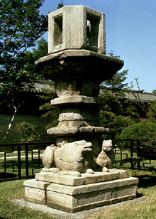 본관 전시실 1층 통로다. 이곳에 들어서면 석등과 높다란 석탑이 눈에 띈다. 중앙에는 고달사 쌍사자 석등(보물 282호·사진)이, 동관 끝에는 경천사 10층 석탑(국보 86호)이 있다. 높이 2.43m의 쌍사자 석등은 여느 쌍사자 석등과 달리 웅크리고 앉은 모양이 특징이다. 경천사 10층 석탑(높이 13.5m)은 고려 충목왕 4년인 1348년에 경기 개풍군 경천사에 건립된 대표적인 석탑. 기단과 탑신에 보살 용 천부가 정교하게 조각돼 있으며 균형미가 뛰어나다. 기단 평면이 ‘아(亞)’자 형으로 3단을 이루고, 윗면의 팔작 지붕과 기왓골은 희귀한 양식이다.
