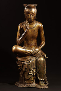 3층에 있는 불교조각실은 ‘반가사유상’(국보 83호·사진)이 전시된 곳이다. 불교미술관의 독립된 방에 전시된 반가사유상은 삼국시대인 7세기 전반에 만들어져 동양 불교 조각사에서 기념비적인 유물로 평가받는 작품. 고구려 6세기 말 평양에서 만들어 유포한 천불(千佛) 중 스물아홉 번째 부처인 인현의불에 해당하는 ‘연가(延嘉) 7년이 새겨진 부처’(국보 119호)나 경주 구황동 3층석탑에서 출토된 부처와 아미타불(국보 79, 80호), 인도 굽타 불상의 영향을 받은 통일신라시대의 아미타불(국보 82호)도 전시돼 있다.