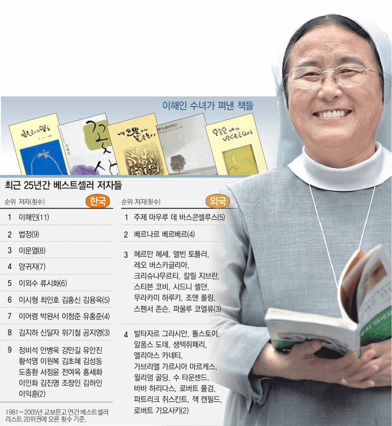 ▽이해인과 바스콘셀루스가 국내와 해외 저자 1위=시인인 이해인 수녀의 책들은 25년 동안에 모두 11차례나 연간 베스트셀러 목록에 올랐다.
