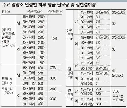 ▽남녀 및 연령대별로 다르게 섭취해야=DRIs는 에너지를 내는 탄수화물 단백질 지방의 적정 비율을 처음으로 제시했다. 갈수록 지방의 비율이 높아져 상한선을 정해줄 필요가 생겼기 때문.