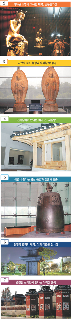 국보 99호 갈항사 3층 석탑 등 국보 보물 11점을 비롯해 30여 점의 문화재가 전시된 야외전시장. 어둠이 내리면 나무들 사이사이에 조명이 들어온다. 여기에 은은한 달빛이라도 비친다면…. 석가탑을 만든 아사달을 그리워하다 끝내 연못에 몸을 던진 백제 여인 아사녀가 생각나는 곳.