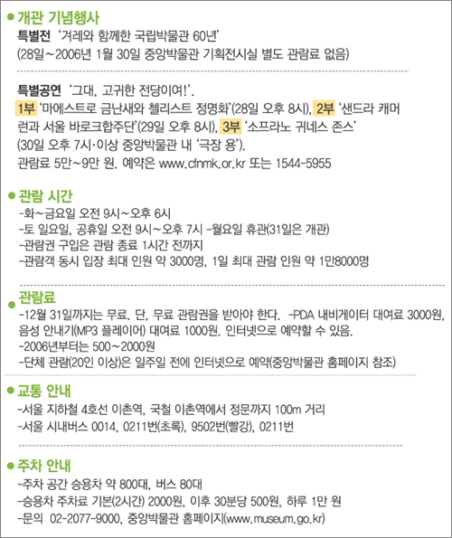 박물관 본관 건물의 출입구인 중앙홀. 그 오른쪽으로 난 복도인 ‘역사의 길’을 따라 들어가면 맨 끝에 국보 86호 경천사 10층 석탑이 우뚝 서 있다. 늘씬한 몸매(높이 13.5m)를 따라 고개를 들어보자. 40여 m 높이의 유리 천장에서 쏟아지는 투명한 햇살, 한동안 발길을 옮길 수 없다.