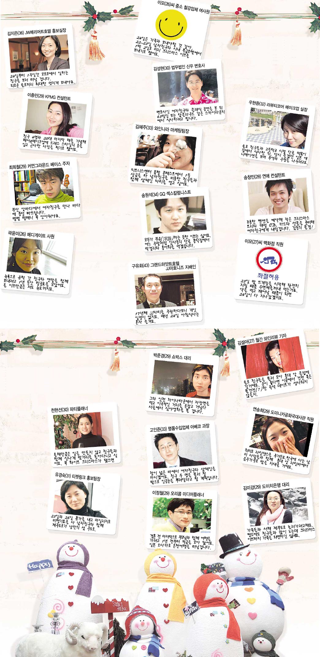 탤런트 아나운서 변호사 프로야구스타 등 다양한 직업을 가진 싱글 남녀 30명에게 크리스마스이브의 계획을 들었습니다. 뉴욕에서 크리스마스를 보내겠다는 화려한 계획부터 수면제 먹고 내리 자겠다는 처절한 결심까지…. 가족과 함께 교회에서 예배를 보고 식사를 하겠다는 이들도 적지 않습니다. 누구와 어디서 무엇을 하든 크리스마스이브의 ‘행사’를 준비하고 기대하는 것으로 그들은 들떠 보였습니다. 어쨌거나 많은 이들이 그날만큼은 특별한 추억을 가지고 싶어 하니까요.