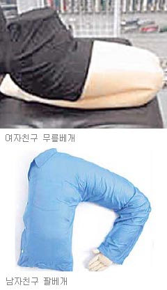 ▽여자친구 무릎베개=일본에서 수입된 제품. 남자 친구가 여자 친구의 무릎에 머리를 벨 수 있도록 한 자세를 베개로 만들었다. 미니 스커트를 입혀 상상력을 더했다. 2∼3년 전 나온 여성용 ‘남자친구 팔베개’의 남성용 버전이다.