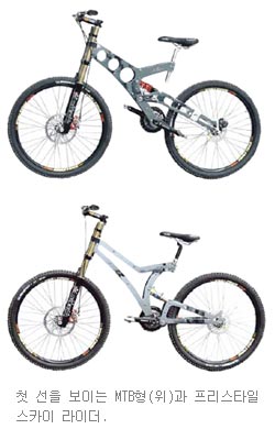 관심을 끄는 제품은 세계 최초로 프레임을 용접하지 않고 만든 ‘스카이 라이더’. 이 제품은 국내 업체에서 개발한 것으로 MTB는 700만∼900만 원, 생활레저 형은 100만∼300만 원이다.