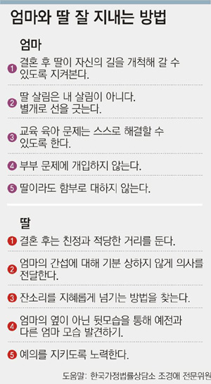 한국가정법률상담소 조경애 상담위원은 “친정 엄마의 개입이 딸을 편하게 해 줄 수도 있지만 오히려 그 반대의 경우가 될 수 있다”며 “진정 딸을 위한다면 시시콜콜 챙겨주고 간섭하는 것보다는 느긋하게 지켜보는 여유가 있어야 한다”고 조언했다.