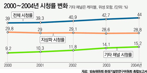 시청점유율 역시 지상파는 2001년 4월 84%였지만 2005년 5월에는 62%로 22%포인트 감소했다. 반면 케이블은 16%에서 38%로 증가했다. 그러나 지상파 자회사 PP를 포함시키면 2005년 5월 지상파의 시청점유율은 72%로 실제로는 12%포인트 감소한 것이었다.