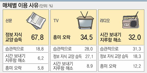 조사결과 각 매체 이용 이유에 대해 신문의 경우 ‘정보 지식 교양 습득’ 다음으로 ‘습관적으로 읽는다’가 18.8%, ‘시간 보내기’(6.2%), ‘흥미 오락’(5.8%) 순이었다.