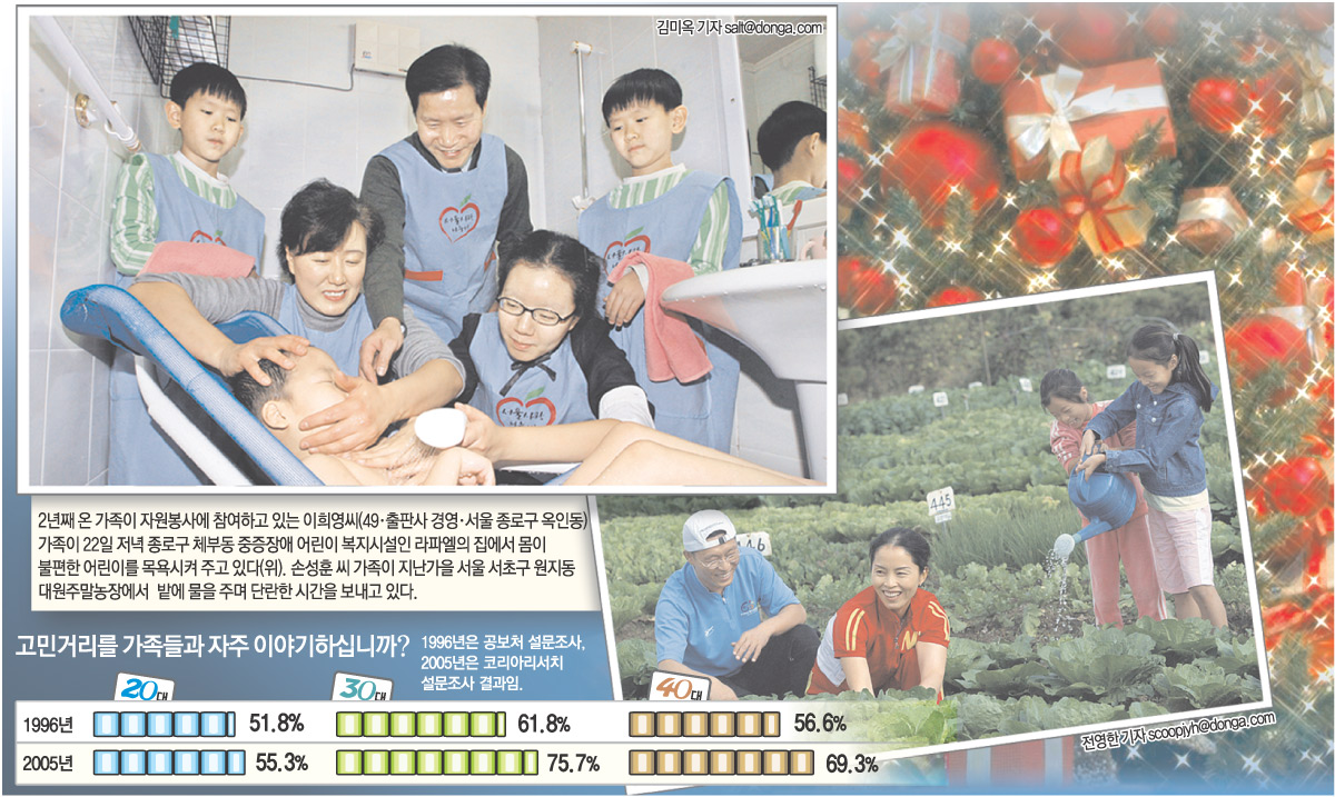지난 일요일 서울 중구 남대문로5가 일대 쪽방촌에서 가족과 함께 도배 자원봉사를 하던 김선우(48·서울 서초구 잠원동) 씨는 “아이들과 함께 봉사하는 즐거움에 푹 빠졌다”며 웃었다. 서울지하철공사 직원인 김 씨는 야근이 잦아 딸 혜리(16) 양, 아들 광순(15) 군과 함께 보내는 시간이 거의 없었다. 가끔 일찍 귀가해도 TV나 볼 뿐 대화는 갈수록 막혀 갔다. 그러나 봉사 나온 첫날 김 씨의 날렵한 도배 솜씨에 아들이 “아버지도 이런 걸 할 줄 아세요”라며 놀라워했고, 부인과의 연애담과 신혼 초 직접 도배를 했던 이야기를 해 주면서 부자간 대화의 물꼬는 자연스레 터졌다.
