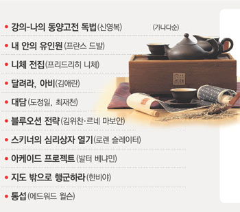 ◇ 강의-나의 동양고전 독법(신영복 지음·돌베개) 화끈하게 달아오르는 도올 김용옥의 고전 강독들과 대비되는 신영복 성공회대 교수의 잔잔히 스며드는 고전강독. ‘감옥으로부터의 사색’에서부터 입증된 옹골찬 한학 실력과 끊임없이 현실을 곁눈질하는 비판의식, 그리고 고졸한 맛이 우러나는 문체가 어우러져 공맹과 노장을 현대적 교양으로 재탄생시켰다. 특히 새것 신드롬에 사로잡힌 시대에 ‘아름다움의 어원은 뭔가를 잘 터득하고 있음’이라는 성찰은 두고두고 되새길 만하다.
