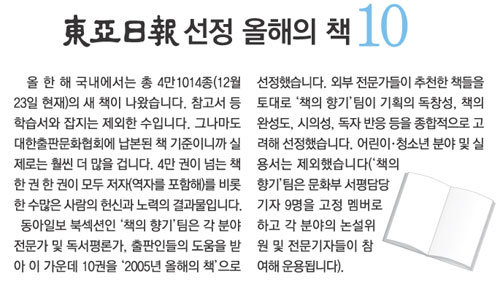 ◇ 대담(도정일 최재천 지음·휴머니스트) 인문학의 수문장을 자처해 온 도정일 경희대 교수와 자연과학과 인문학의 담벼락을 타고 넘는 데 귀재인 최재천 서울대 교수의 치열한 ‘지적 공방전’을 정리했다. 생명복제와 DNA혁명으로 상징되는 생물학을 가교로 삼아 인문학과 자연과학의 소통 가능성과 통합 불가능성이 논박되는 과정에서 다양한 지식의 향연이 펼쳐진다. 함께 ‘올해의 책’에 선정된 ‘통섭’이 인문학과 과학의 통합을 예언했다면 이 책은 이의 실천이라 할 만하다.