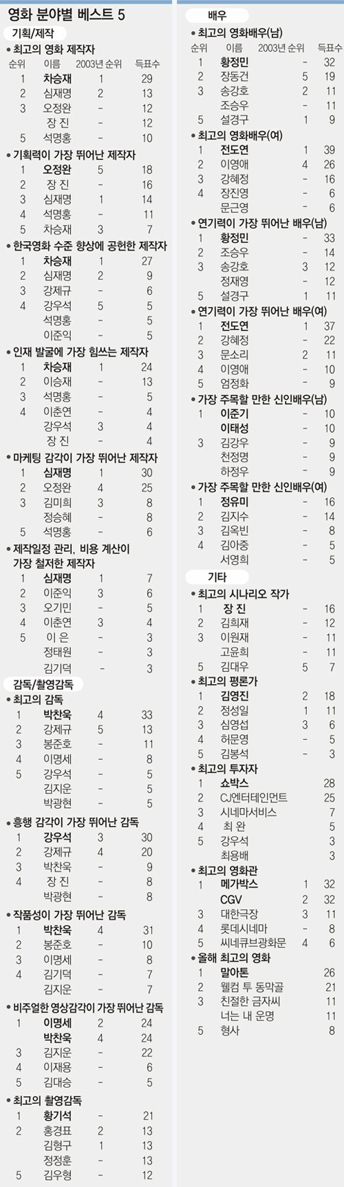 제작자의 경우 2003년 ‘최고의 제작자’ 등 3개 부문에서 5위 안에 들었던 신씨네의 신철 대표가 올해 조사에선 순위에 들지 못했다.