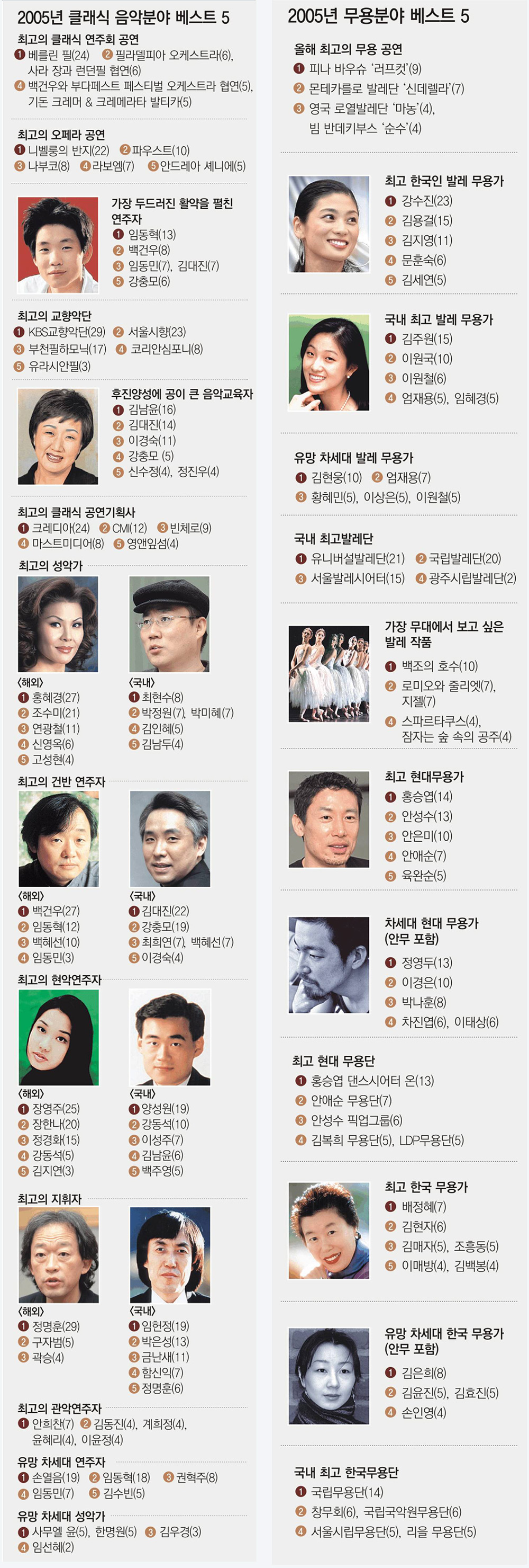 《2005년 최고의 클래식 연주회 공연으로는 21년 만에 지휘자 사이먼 래틀과 함께 내한한 베를린 필의 연주가 꼽혔고, 올해 가장 두드러진 활약을 한 연주자로는 쟁쟁한 대가들을 물리치고 젊은 피아니스트 임동혁(21)이 꼽혔다. 올해 무용 분야에서는 독일 부퍼탈무용단의 피나 바우슈가 한국을 소재로 안무한 ‘러프컷’ 초연이 최고의 공연으로 꼽혔다. 본보가 2003년에 이어 클래식과 무용계 각 분야를 대표하는 예술가와 관계자들에게 자기분야의 ‘고수(高手)’를 꼽는 설문조사를 실시한 결과 음악, 무용분야에서도 신진 예술가들의 약진 등 지각변동이 나타났다. 응답자들에게는 각 항목에 대해 3명 또는 3개 작품을 선정하도록 주문했다. 클래식 분야는 35명, 무용 분야는 23명이 설문에 참여했다.》