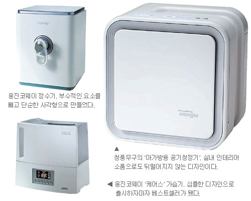 웅진코웨이는 정수기 시장의 선두 주자다. 선두는 후발 주자들이 따라오면 다시 멀리 가야 하는 혁신의 숙명을 안고 산다. 그 역할을 하는 것이 디자인이다. 코다스가 2004년 디자인한 웅진의 정수기는 무미건조하다고 할 정도로 군더더기 없는 박스 형태로 바뀌었다. 웅진코웨이의 케어스 가습기도 기존의 알록달록한 반투명의 플라스틱 가습기들과 다른 디자인으로 출시하자마자 하이마트에서 가습기 판매 1위를 기록했다.