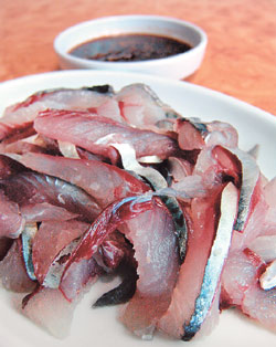 고등어 회는 제주도의 명물 중 명물이다. 횟감은 낚싯배로 매일 새벽 잡는다. 산 것만 횟감으로 쓸 수 있기 때문이다. 낚시로 잡은 고등어는 찌개용 고등어에 비해 종류와 크기가 다르다. 20∼30cm로 작고 날씬하다.