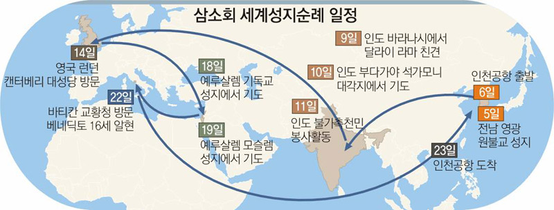 순례단은 5일 원불교를 창시한 소태산 대종사의 대각지(大覺地)인 전남 영광 성지를 방문하는 것을 시작으로 인도 부다가야의 석가모니 대각지, 델리의 힌두교사원, 영국 런던의 캔터베리 대성당, 이스라엘 예루살렘의 기독교 성지 및 모슬렘 성지, 나사렛동산, 이탈리아의 아시시 수도원과 바티칸 교황청 등을 방문한다. 여행 도중 인도 바라나시에서 티베트 종교 지도자인 달라이 라마, 바티칸에선 교황 베네딕토 16세를 각각 알현한 뒤 23일 귀국한다.