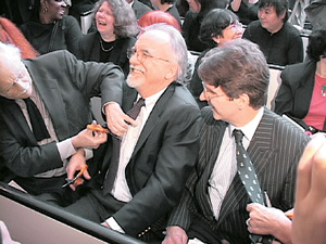3일 미국 뉴욕 맨해튼에서 열린 백남준 씨의 장례식장에서 조문객들이 옆에 앉은 사람들의 넥타이를 자르며 과거 ‘넥타이 자르기 퍼포먼스’를 통해 고정관념을 파괴하고자 했던 고인을 추모하고 있다. 뉴욕=공종식 특파원