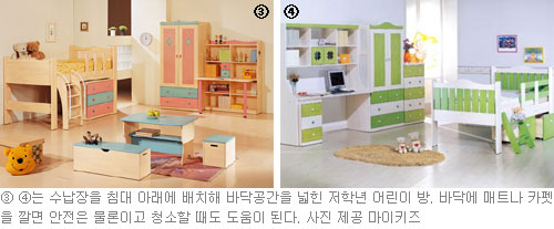 이 시기 어린이 방의 중심 기능 중 하나는 놀이 공간이다. 그러므로 바닥 공간을 최대한 확보해야 한다. 블록 퍼즐 인형놀이 소꿉장난 등 쉽게 즐길 수 있고 교육 효과도 있는 놀이들은 대부분 바닥 공간에서 이뤄지기 때문이다.