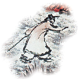 소정이 그려낸 거대한 산자락이나 금강산 계곡, 혹은 평범한 들판 사이를 자세히 들여다보면 머리에 갓 쓰고 노란색 두루마기를 입은 노인들이 휘적휘적 걸어가는 모습을 볼 수 있다(‘외금강 삼선암 추색’ ‘내금강 보덕굴’ ‘천태폭포’ 등). 마치 낙관처럼 소정의 대표작에 등장하는 ‘황포노인’들이다. 그림 속 노인을 따라가다 보면, 우리가 발 딛고 사는 땅이 바로 이상향일 수 있다는 소정의 생각에 고개가 절로 끄덕여진다.